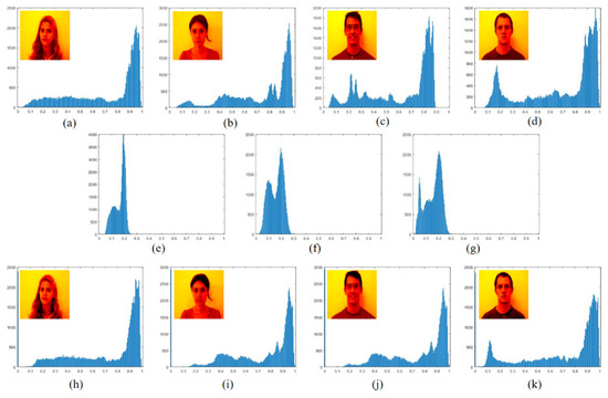 (a–d) Histograms of 4 plaintext images. (e) Superimposed light intensity histogram after encoding the first two images. (f) Superimposed light intensity histogram after encoding of the last two images. (g) Histogram of the final ciphertext image. (h–k) Histograms of the decrypted image.