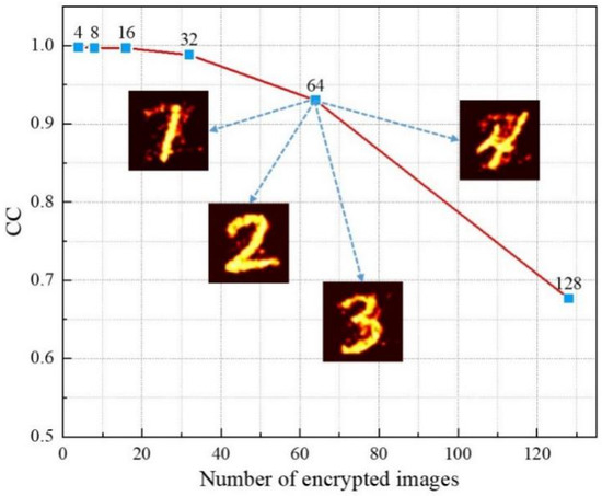 The number of encrypted images in multiple image encryption will directly affect the application of the algorithm in practice. Next, we analyze the relationship between the number of encrypted images and the quality of decrypted images. As shown in Figure 15, taking four images per group, as the number of encrypted images increases, the decryption result decreases. However, when the number of encrypted images is 64, the content of the image can still be clearly distinguished, which cannot be achieved by the traditional multi-image encryption algorithm [21,22,23,24,25]. Due to the limitation of image size, the sampling ratio in the frequency domain is too small to achieve better decryption when the number of encrypted images is 128.