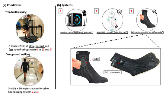 Conditions and measurement systems used for data acquisition. (a) Participants performed three 2 min treadmill walking trials at slow, normal, and fast walking speeds and three 10 m overground walking trials at a self-selected comfortable speed. (b) A motion capture system was used as the gold standard to validate the estimations of the spatio-temporal parameters for treadmill walking based on the IMU-instrumented sock and the Mobility Lab system.