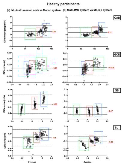 Concurrent validity. Bland–Altman plots of the differences between (a) the TEADRIP algorithm applied to the IMU-instrumented sock recordings and the Mocap system, and between (b) the Mobility Lab system and the Mocap system during two-minute treadmill walking at different speeds in HP (n = 25, 2 sessions). Cadence (CAD), gait cycle duration (GCD), gait speed (GS), stride length (SL), and Motion capture system (Mocap). The solid lines indicate the mean test-retest differences (bias) and the dashed lines indicate the upper and lower 95% limits of agreement (1.96 SD of the bias). Dashed green, red, and blue squares represent the observations for slow, normal, and fast speeds, respectively.