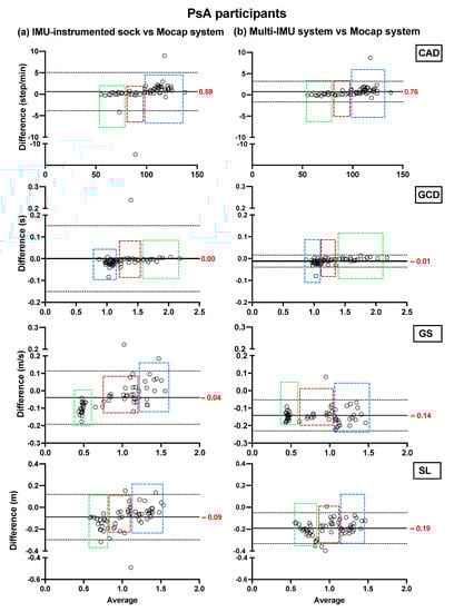 In HP, the biases of the temporal parameter estimations from the IMU-instrumented sock were higher than those obtained from the ML system while those of the spatial parameter estimations were lower. In PsA patients, the biases of the temporal and spatial parameters from the IMU-instrumented socks were both lower than those obtained from ML. However, 95% limits of agreement around the difference between the motion capture system and the ML system estimates were narrower than those between the motion capture system and those based on the IMU-instrumented sock.
