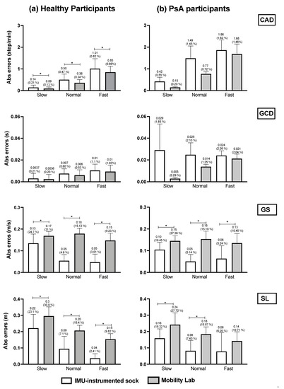 Accuracy comparison between the TEADRIP algorithm applied to the IMU-instrumented sock recordings and the Mobility Lab system estimations of the spatio-temporal parameters in (a) healthy and (b) PsA participants. Mean absolute errors and relative errors (%) in CAD, GCD, GS, and SL estimations obtained from the IMU-instrumented sock and the Mobility Lab system during 2 min treadmill walking at different speeds. Cadence (CAD), gait cycle duration (GCD), gait speed (GS), stride length (SL), Psoriasic arthritis (PsA). *: p < 0.05.
