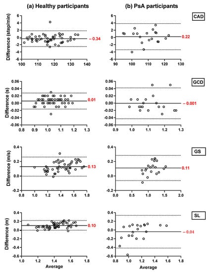 Agreement between the TEADRIP applied to the IMU-instrumented sock recordings and the Mobility Lab system. Bland–Altman plots of the differences between the IMU-instrumented sock and the Mobility Lab system in the spatio-temporal estimations measured for overground walking in (a) healthy and (b) PsA participants. The solid lines indicate the mean test-retest differences (bias) and the dashed lines indicate the upper and lower 95% limits of agreement (1.96 SD of the bias).