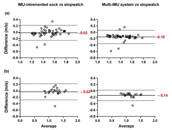 The Bland–Altman plots of the averages and differences between the estimations of the spatio-temporal parameters obtained from the IMU-instrumented sock and those obtained from the ML system are presented in Figure 5a,b. The results show a good agreement between the two systems across all parameters when healthy and PsA participants performed the 10MWT at a self-selected comfortable speed. The biases were lower in PsA patients (Figure 5b) compared to HP (Figure 5a). However, the limits of agreement were narrower in HP. The ICCs presented in Table 3 show good to excellent intersession reliability for all the measurements obtained with the two systems (Table 3). In the same table, the results show a good but lower reliability coefficient (ICC = 0.77) of the stopwatch measurement of gait speed. The Bland–Altman plots of the agreement between the two systems and the 10MWT in healthy and PsA participants (Figure 6a,b) show a good agreement between both systems and the values of GS obtained from the stopwatch. However, the estimation of GS obtained by the IMU-instrumented sock had a lower bias than that from the ML system (−0.02 vs. 0.15 in HP, and −0.03 vs. −0.14 in PsA participants, p < 0.0001).