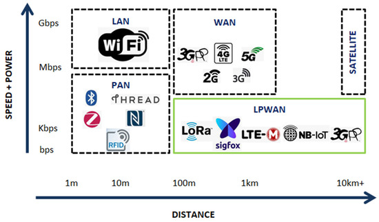 Figure 2, which is suitable for connecting objects implementing significantly autonomous applications. LoRa makes use of ISM free-use frequency bands, shared with other wireless technologies. So, it is obliged to comply with defined usage rules, particularly concerning the transmission power, the duty cycle, and therefore, bandwidth. The most common use cases of LPWAN networks are Smart Cities, connected industries, and isolated data measurement [