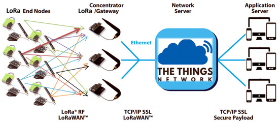 Figure 5 depicts a scheme of the network topology, with the various hierarchical layers from the End nodes, the Gateways/Concentrators, the network server and the application server.