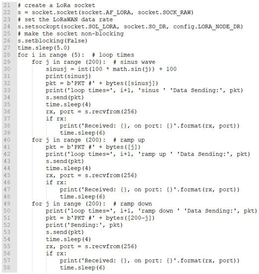 Figure 6 lines 21–58). It is apparent how easy is to configure all the critical operating parameters of the LoRa nodes.