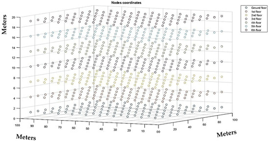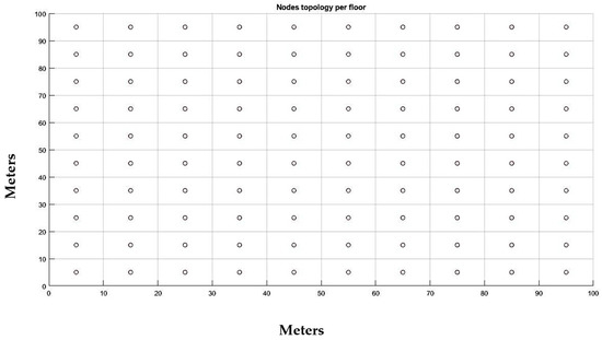 Next, we present the scenario that was implemented as well as the results of the Packet Delivery Ratio (PDR) that were taken from the simulation. We considered a seven-floor building made of concrete as the basis of our scenario. The dimensions of the building were 100 m × 100 m × 21 m, thus each floor was 3 m tall. We considered that there were 100 rooms per floor, with each room having dimensions 10 m × 10 m × 3 m. Finally, we considered that each room in the building faces inwards to at least one corridor through a door and all external walls have windowpanes as well as the masonry partitions, placed in high positions. The building could represent a hospital in which the IAQ nodes could be installed to measure the IAQ of each room. For this simulation, we did not consider any possible metal or plastic installation, machinery, or any other obstacles within the building. Then, we considered that an IAQ node will be installed in every room. The nodes were installed at the center of each room, 1.2 m above its floor. In total, there were 700 nodes installed in the building. In