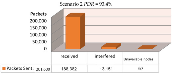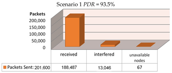 Figure 9. We may notice that only 6.5% of all transmissions were interfered with and lost, and merely 67 out of 201,600 messages were lost because of unavailable node connections with the gateway as pointed out by the simulation program, and we have zero losses due to low sensitivity or due to a busy transmitting gateway. For the second scenario, where the gateway was installed at the roof of the building, the PDR that was achieved reached the amount of 93.5%, as can be seen in