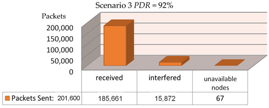 Figure 10. Here, we noticed a 6.5% loss because of transmission interference, 67 out of 201,600 messages were lost because of unavailable node connections with the gateway due to a busy transmitting gateway, and again zero losses due to low sensitivity. Finally, for the third and final scenario, where the gateway was installed at the roof of a duplicate neighboring building, a PDR of 92.0% was achieved as can be seen in