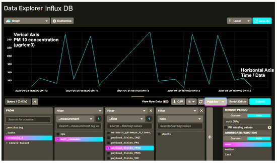 We have integrated our sensor data with Influx Database (InfluxDB), being a time-series optimized database toolkit that contains an all-in-one package of dashboards, queries, tasks, and agents. InfluxDB includes a User Interface (UI) that features a Data Explorer, dashboarding tools, and a script editor, enabling a multi-tenanted time-series, background processing, and monitoring agent, thus, providing a flexible deployment and setup suitable for storing IAQ measurements. As depicted in