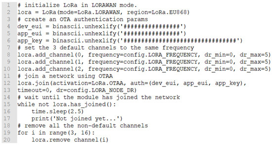 In the snippet that follows, we provide an overview of the code implementation for the Lora-enabled LoPy4 node. The code is written in MicroPython using the PythonMkr development environment and it is ultimately stored as firmware in the LoPy4 node’s non-volatile program memory. In this specific part of the code, we can see the LoRa node’s initialization, the over-the-air authentication (OTAA) (Figure 6 lines 1–20), and the algorithm for the creation of a non-blocking socket (Figure 6 lines 21–58). It is apparent how easy is to configure all the critical operating parameters of the LoRa nodes.