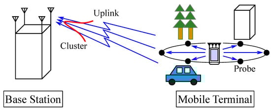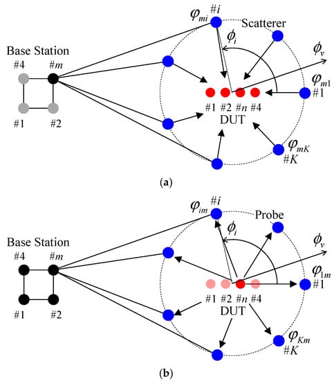 In the uplink illustrated in Figure 2b, channel reciprocity theory is used to describe that radio waves emitted from the DUT antennas received by the BS antennas via the probes surrounding the DUT. As mentioned in Section 2, in this paper, the initial phase of the probes represents the BS correlation characteristics for the whole uplink channel including the path and the BS antenna properties.