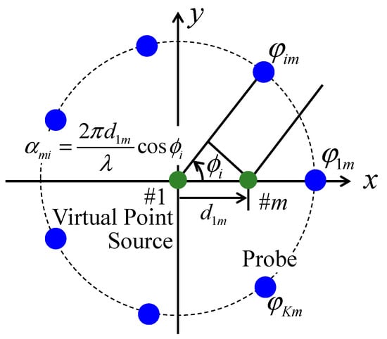 Figure 7 shows the arrangement of the virtual point sources in a 4 × 4 MIMO system. By placing this model in the center of Figure 3, the geometrical phase difference can be calculated using Equation (3) to generate the initial phase matrix described in Equation (4). The arrangement of the virtual point sources in Figure 7 varies in an arbitrary fashion by changing the distance relationships between the virtual point sources according to the desired 4 × 4 correlation matrix.