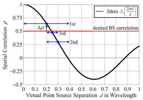 In this paper, the geometrical phase difference required to complete the desired BS correlation is determined via the bisection method using Jakes’ model, as depicted in Figure 4. First, the distance between the virtual point sources is set to the range from 0 to 0.4 λ, as denoted by the blue arrows in Figure 4, so that the spatial correlation satisfies 0–1. Then, the spatial correlation at d = 0.2 λ, which is the midpoint of the blue arrow, is calculated using a zeroth-order Bessel function of the first kind, as indicated in Equation (2). If the absolute value of the difference between the calculated spatial correlation and the desired BS correlation, , is less than the threshold value, which is a sufficiently small value, the distance between the virtual point sources is set. When it is greater than the threshold value and the calculated spatial correlation is greater than the desired BS correlation, the range of the distance between the virtual point sources is modified to the upper half of the original range. In the other case, the range is changed to the lower half. By repeating this operation, the distance between the virtual point sources that enables the desired BS correlation can be determined with high accuracy. Notably, the distance between the virtual point sources is set to 0 when the desired BS correlation is 1.