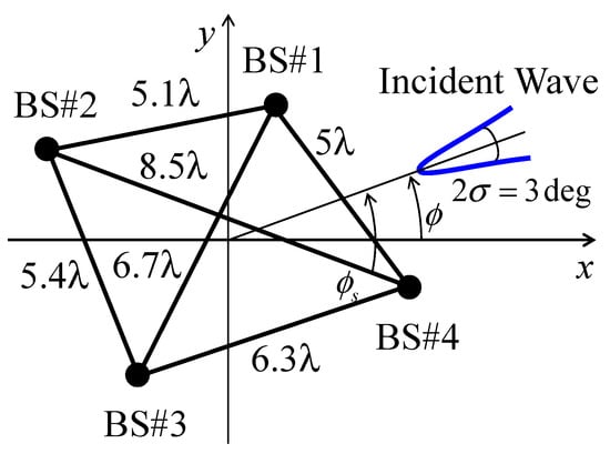 For generality, Figure 5 shows a model in which four BS antennas are arranged arbitrarily. In the figure, the wavelength numbers denote the distances between the antennas. The four BS antennas are isotropic antennas. When the angular spread of the incident wave is sufficiently narrow, the spatial correlation (absolute value of the complex correlation) between the antennas can be calculated as follows [31]: