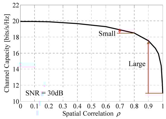 Figure 6 shows the relationship between the channel capacity of a 2 × 2 MIMO system calculated using Shannon’s theorem and the spatial correlation [32]. The signal-to-noise ratio (SNR) is set to 30 dB. The analytical results in Figure 6 show that the impact of the change in spatial correlation on the MIMO channel capacity is very large in high-correlation situations.