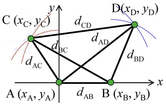 The relationship between the four virtual point sources (A, B, C, and D) in Figure 7 and the BS antennas (BS #1, #2, #3, and #4) is determined according to the desired 4 × 4 correlation matrix. First, the maximum distance is identified from the six distances between the four virtual point sources, and these are labeled, for example, as dCD in Figure 7. In the case of Figure 5, d13 is dCD; thus, points C and D are either BS #1 or #3. As a result, points A and B become either BS #2 or #4, and dAB is set to d24. Second, the maximum distance is identified from the remaining four distances, and this is set to dAD, which is the diagonal of the implementation model. In Figure 5, d23 is dAD. Therefore, points A, B, C, and D are uniquely determined to be BS #2, BS #4, BS #1, and BS #3, respectively. Finally, the coordinates of the four virtual point sources are established. The coordinates of point A (xA, yA) are used as the origin. The coordinates of point B (xB, yB) may be any point on the circumference of radius dAB centered on point A; however, those are set to (dAB, 0) on the x-axis. The coordinates of point C (xC, yC) are the intersection of the circumference of radius dAC centered on point A and the circumference of radius dBC centered on point B, as illustrated by the red arcs in Figure 7. However, when dBC > dAC + dBA, the coordinates of point C are set to (−dAC, 0) so that dAC and dAB are satisfied, and dBC is set to the longest possible value. Similarly, the coordinates of point D (xD, yD) are at the intersection of the circumference of radius dAD centered on point A and the circumference of radius dBD centered on point B, as illustrated by the blue arcs in Figure 7. As before, when dAD > dAB + dBD, the coordinates of point D are set to (dAB + dBD, 0) so that dAB and dBD are satisfied, and dAD is set to the longest possible value. The virtual point source arrangement of the implementation model in Figure 5 is shown in Figure 8a.