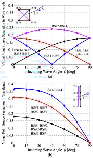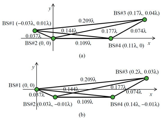 The initial phase matrix for each BS antenna is created by calculating the geometric phase difference for the designed implementation model, as shown in Figure 8a, with reference to the initial phase matrix of BS #1. Therefore, the coordinates of the virtual point source for BS #1 is translated to the origin, as presented in Figure 8b. Using the above method, the arrangement of the virtual point sources to complete the 4 × 4 correlation matrix, which is dependent on the arrangement of the BS antennas, the direction of the incident wave, and the angular spread of the incident wave, can be determined.