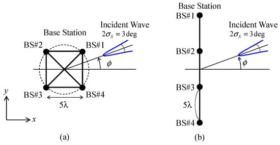 Figure 9 shows the relationships between conventional BS antenna arrangements and the incoming wave angle . In this paper, two types of four-element BS antennas are considered: a circular and a linear array installed at equal intervals, as illustrated in Figure 9a,b, respectively [33]. The distance between adjacent antennas was set to 5 λ.
