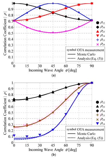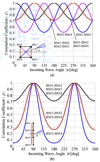 In the case of the circular array, illustrated in Figure 9a, the angle of the incident wave for the BS array constructed by BS #1 and BS #2 at the incoming wave angle is the same as that constructed by BS #3 and BS #4, whereas the angle of the incident wave for the BS array constructed by BS #1 and BS #4 at is the same as that constructed by BS #2 and BS #3. Consequently, ρ12 and ρ14 coincide with ρ34 and ρ23, respectively, regardless of the incoming wave angle , and there are four types of BS correlation characteristics, as shown in Figure 10a.