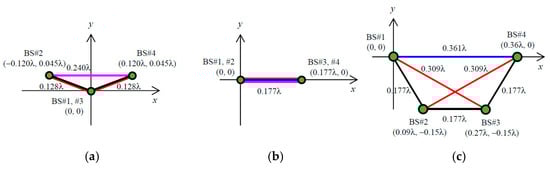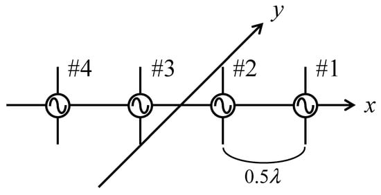 In the case where the incident wave angle for the x-axis is 0°, the spatial coefficient between BS #1 and BS #2, ρ12, is 0.987 (using Equation (5)), and the distance between the virtual point sources of BS #1 and BS #2 to realize ρ12 = 0.987 is 0.037 λ (using the bisection method mentioned in Section 3). Similarly, ρ13, ρ14, ρ23, ρ24, and ρ34 are 0.614, 0.805, 0.713, 0.885, and 0.947, then d13, d14, d23, d24, and d34 are 0.209 λ, 0.144 λ, 0.177 λ, 0.109 λ, and 0.074 λ, respectively.