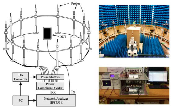 In the multiple probe antenna based method, such as one with a fading emulator, a number of test antenna probes located in the chamber reproduce the channel characteristics in a controlled and repeatable manner to test MIMO performance [13,14,15,16,17]. The disadvantage of this method is that it requires many instruments, such as a probe antenna, a power divider, and a phase shifter. However, a fading emulator is capable of emulating realistic and accurate multipath environments [20,21,22,23,24].