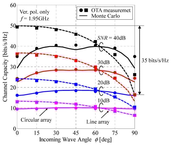 The MIMO channel capacity was measured using a two-dimensional bidirectional fading emulator to evaluate the performance of the four-element MIMO terminal uplink channel. Figure 16 shows the 4 × 4 MIMO (four elements in the mobile terminal and four elements in the BS) channel capacity as a function of the incoming wave angle with the SNR as a parameter. The MIMO terminal illustrated in Figure 14 was placed at the center of the bidirectional fading emulator. The round and square symbols denote the OTA measurement results for the circular and linear arrays at the BS, respectively. The solid and broken curves indicate the Monte Carlo simulation results for the circular and linear arrays at the BS, respectively. The SNR was changed from 10 to 40 dB in 10 dB intervals [35]. The frequency was 1.95 GHz, and the XPR was set to 50 dB, which is equivalent to a vertically polarized propagation environment.