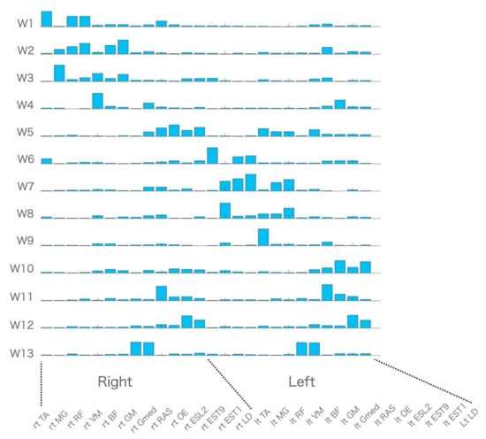 Visual inspection revealed that muscle synergies W1 to W5 were largely composed of the right-side muscles, while muscle synergies W6 to W10 were mainly composed of the left-side muscles. Thus, we categorized W1 to W5 as muscle synergies with right-side dominant patterns and W6 to W10 as muscle synergies with left-side dominant patterns. The following pairs showed high similarity when the muscles in W6 to W10 were reordered so that muscles on the left side of W6 to W10 corresponded to the same muscles on the right side of W1 to W5: W1 and W6 (SP = 0.93), W2 and W7 (SP = 0.97), W3 and W8 (SP = 0.97), W4 and W9 (SP = 0.85), W5, and W10 (SP = 0.93). Others, such as W11, W12, and W13, were categorized as bilateral patterns.