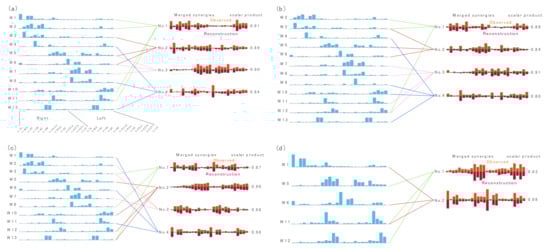 To explore muscle synergies, nonnegative matrix factorization (NMF) was used for each subject from the single-task EMG matrices and the all-task EMG matrix. NMF has previously been described as a linear decomposition technique [33,34] according to Equation (1):