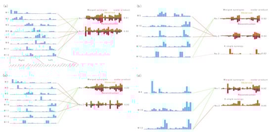We also expected that all-task muscle synergies can be merged to execute each single task of movement and posture [40]. Thus, the merged synergies as a linear combination of the contributing synergies were modeled by the following formula [18,41]: