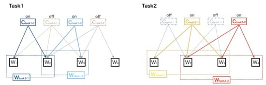 A hypothetical neural mechanism of merged fundamental muscle synergies with its temporal patterns in a diverse range of human behaviors. This model shows that the CNS flexibly recruits multiple synergies for different tasks. For example, Ctask1-1 with W1 and W2 and Ctask1-2 with W2 and W3 turn on while Ctask2-1 and Ctask2-2 turn off to execute task 1. Similarly, Ctask2-1 with W1, W2, and W3 and Ctask2-2 with W2, W3, and W4 turn on, ceasing to be active in Ctask1-1 and Ctask1-2 for task 2.