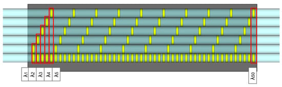In the following experiments we used two different types of FBG-based temperature sensors inscribed in Fibercore SM1500(9/125)P polyimide-coated fiber by using femtosecond IR laser pulses [21]. The first one was a highly dense sensor composed of 50 uniform FBGs equidistantly arranged along 50 mm fiber segment. Each of the gratings had a length of 0.95 mm and was separated from the neighboring by 0.05 mm, as shown in Figure 1. The resonant wavelengths of the FBGs in the array were chosen to uniformly fill the spectral range of the used 8-channels HBM FS22-SI interrogator (1500–1600 nm). The interrogator operated in optical spectrum analyzer mode providing 1 Spectrum per second refresh rate, 20,001 points per spectrum, and 5 pm resolution. The second type of FBG array was an array containing only intermediate elements of a highly dense array, as shown in Figure 1. Due to the decrease in the FBG density, the reflection spectra the array possess a less noisy shape, making it possible to use such a sensor as a reference when processing the data of a highly dense sensor.