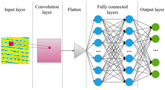 We also chose a convolutional neural network (CNN) for the task, because of its potential capability to reveal hidden features related to interference between reflectance patterns of nearby FBGs (Figure 6). The input layer was a two-dimensional array of the reflectance pattern, after which there was a layer with one convolutional filter of size 2 × 2 and Relu activation function. The 2-dimensional convoluted image was then flattened and transferred to two fully connected layers. The size of the last output layer was 50 neurons.