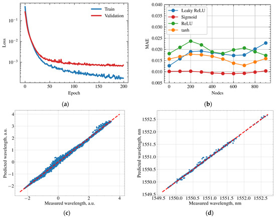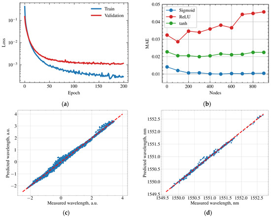 The learning curve of the FCNN on a training dataset and prediction error on a validation dataset are depicted at Figure 8a. We plotted the curves on a logarithmic scale for the convenience of their analysis. During training epochs loss function (mean absolute error) drops down and saturates after 100 epochs. The evolution of the prediction error (orange line) shows that the neural network was not overfitted. Figure 8b shows mean absolute error rates for different activation functions and number of nodes at the hidden layer. Figure 8c demonstrates the predicted positions of the reflectance peaks for all 50 FBGs of the sparse sensors against measured ones in scaled units. Figure 8c is the same curve for a single FBG in nm units. The curves are in close proximity to the straight line corresponding to the ideal case when predicted values are equal to measured values. We found out that FCNN is able to predict the positions of the reflectance peak of the sparse FBG sensors with a mean absolute error equal to 10.9 pm. The root mean square error (RMSE) was 18 pm and the coefficient of determination (R2) was 0.9988.