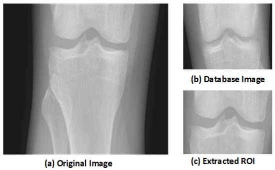 The block with the minimum MAD is selected as the ROI that contains the knee joint. The knee image that is used in the database is shown in Figure 1b. Figure 1a shows the original knee image, while Figure 1c shows the selected ROI. The selected region has essential features as it shows the joint space width (JSW).