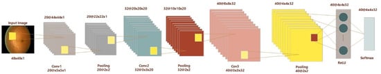 In our proposed system, the first layer of a 2-dimensional CNN is a convolutional layer that has a filter size of 20 while the stride size is 1. It is followed by the max-pooling layer with a size of 2 × 2 and a stride of 1. The next layer is a convolutional layer with a stride size of 1 and a filter size of 32. All the first six layers are arranged alternatively as the convolutional and max-pooling layers. The next seventh layer is the activation layer that has a Rectified Linear Unit (ReLU), while the next layer is the convolutional layer with a filter size of 40 (4 × 4 × 32). The final layer is a softmax function layer. The weights of the convolutional layers and the values of operators in max-pooling layers should be steady for valuable computations. In our datasets, the image size is 50 × 50 × 1, which converts into a size of 1 × 1 × 2 with the help of forwarding propagation of all layers [51]. Deep Neural Network layers used for the proposed technique are shown in Figure 2. CNN has convolutional layers that take the input of image I, filters are applied as f having dimensions as m × n with length l weights as w and bias as b. So, the output can be written in the form of an equation as below:
