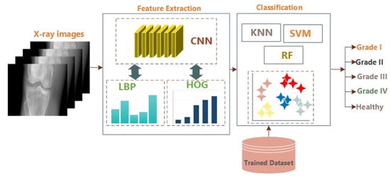 - To propose a novel robust algorithm that can carry out early detection of KOA according to the KL grading. The proposed algorithm uses X-ray images for training and testing the results. The hybrid features descriptors extract features, that is, CNN with HOG and CNN with LBP. Three multi-classifiers are used to classify disease according to the KL grading system (I, II, III, IV), such as KNN, RF, and SVM;