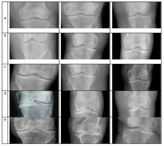 Different images taken from the Dataset: row (a) Normal Images; (b) Doubtful Images; (c) Mild; (d) Moderate; (e) Severe [48].
