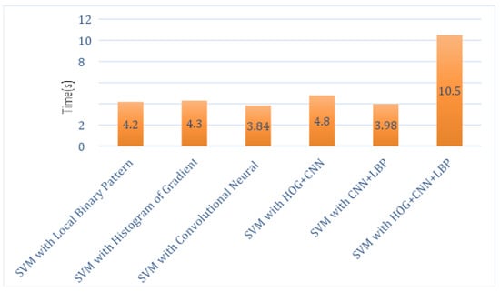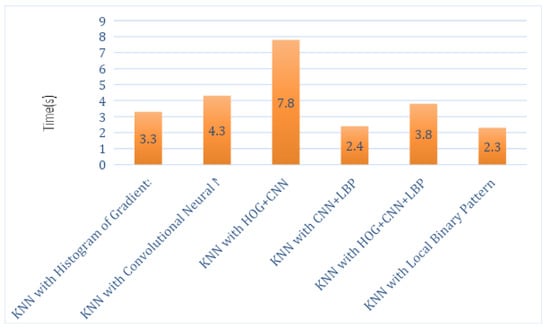 The total execution times of this hybrid proposed system for each feature descriptor with all classifiers, such as SVM, RF and KNN, are computed as shown in Table 2, Table 3 and Table 4. Analysis graphs are shown in Figure 5, Figure 6 and Figure 7. The time taken by the SVM classifier with LBP is 4.2 s, and the shortest time is by SVM_CNN, which is 3.84 s. However, the shortest time of SVM_CNN is also more significant than the shortest time of KNN-LBP, which is 2.3 s.