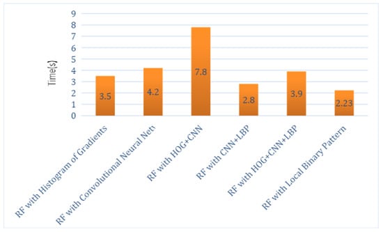 Time: The RF’s shortest time with a local binary pattern that is 2.23 s as described in Table 2, Table 3 and Table 4. The time taken by the SVM classifier with LBP is 4.2 s, and the shortest time by SVM is with CNN, which is 3.84 s. The shortest time by KNN is with LBP, which is 2.3 s.
