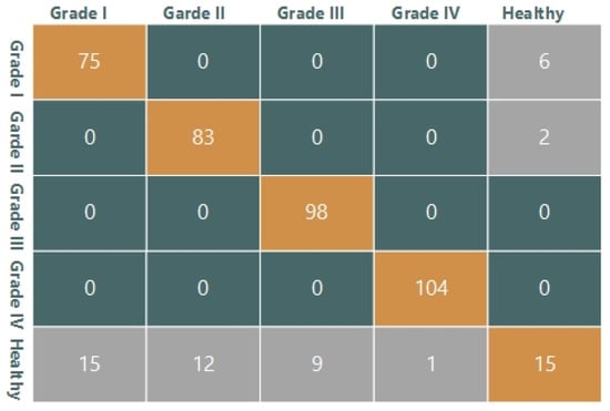 - We analyzed the performance of individual grade detection during cross-validation, revealing the following facts for the classification: The algorithm obtained 98% accuracy for Grade I, 97% accuracy for Grade II, 98.5% accuracy for Grade III and Grade IV;