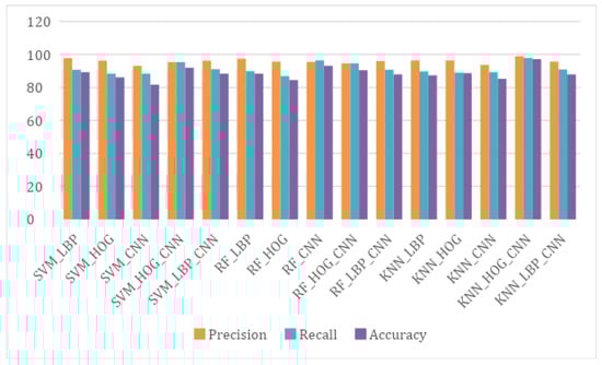 Precision: Precision P is calculated and represents the percentage of those accurately classified by the proposed system. The highest precision value obtained for the KNN classifier using Convolutional Neural Network with Histogram of Oriented Gradient was 98.96%. A comparison of different proposed algorithms is given in Table 8 in order to select the best and a graphical representation is shown in Figure 9. The average and standard deviations of all the proposed algorithms are also reported in Table 8. The equation of precision is given below: