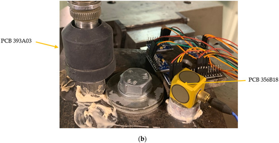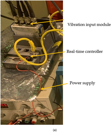 The acquisition system of the two studied accelerometers can be seen in Figure 1a. As illustrated in this figure, both accelerometers were connected to the real-time controller equipped with the vibration input module. Finally, the real-time controller was connected to a computer using a LAN wire. The used accelerometers and their positioning in the laboratory tests are illustrated in Figure 1b.