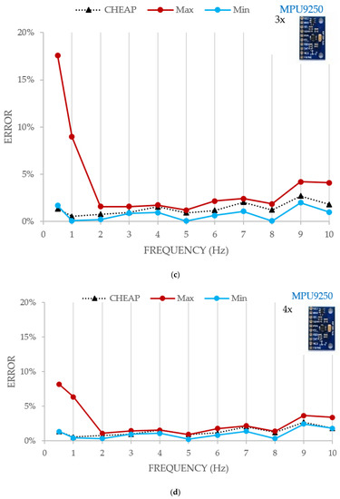 In Figure 5, estimated errors obtained for a different number of sensors in CHEAP are compared. The Max and the Min in each graph represent the enveloped error for all the possible sensor selections from the five available accelerometers (CHEAP represents the proposed kit with five sensors). It is also worth mentioning that in this work only the data outputs of Z-axis of MPU9250 sensors were used. Concordantly, the orientation of X and Y axes of these sensors are not important in this work. They have been distributed with only their Z-axis paralleled.
