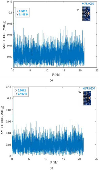 For reporting the resolution of each system from the FFT diagram, the amplitudes of acquired signals were investigated. It is known in this figure that the MA should have a frequency of 0.5 Hz. As a result, any other wave can be considered as an unwanted signal, and the highest amplitude among these unwanted signals is the resolution of this system. Table 4 reports the IA for the signal with a frequency of 0.5 Hz as 0.1006 Milli-g. The analysis of Figure 6a illustrates that with four MPU9250 accelerometers, the resolution of the system is slightly less than 0.08 Milli-g. This resolution enabled locating the needed signal from the FFT output diagram possible. This figure reports the MA of the signal as 0.10384 Milli-g, which has a 3.22% error from the IA. On the other hand, the analysis of Figure 6b shows that the kit of sensors with five MPU9250 (CHEAP) provides a resolution of around 0.06 Milli-g. In addition, it was deducted that CHEAP had an error of 1.55% from the IA.
