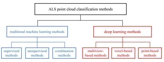 Figure 1 shows the different ALS point cloud classification methods intuitively. The significant difference between traditional machine learning methods and deep learning methods is that the former generally relies on low-level features, such as hand-engineered features, whereas the latter has the ability to learn high-level features to improve the classification accuracy. In addition, PointNet and its improved methods, as well as the methods based on the graph neural network, belong to point-based methods because they directly process the raw points.