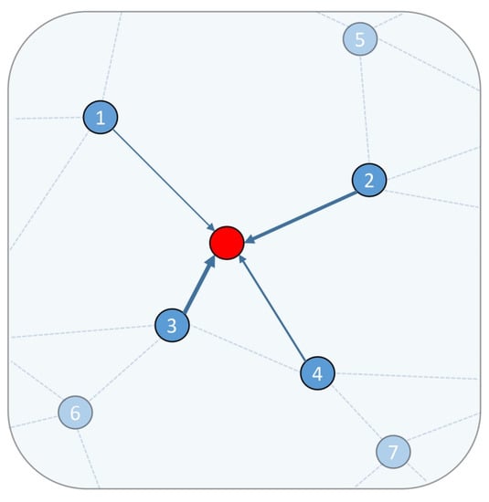Illustration of the NFFU for a subgraph of a point cloud. The red point is a subsampling point, and is called the center point. The four points (point 1 to point 4) are the nearest neighbors of the central point. The features of the neighborhood set are aggregated to the center point by employing the NFFU. The blue solid line with different widths represents the different attention coefficients of each neighbor.