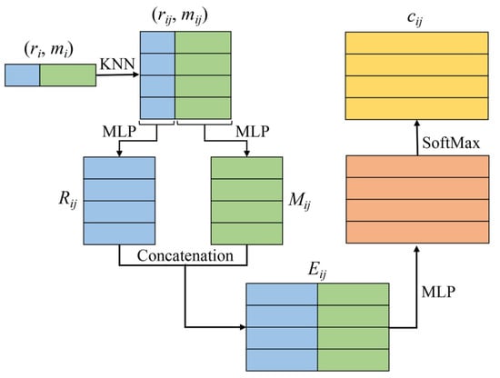 (2) Calculation of the attention coefficient for all neighbors. This step includes four parts: encoding raw features, encoding intermediate learned features, fusing the above two features, and calculating the attention coefficient. The raw features of each center point and its neighbor are denoted as ri and rij, respectively, and the feature vector includes x-y-z coordinates and intensity values, where j∈ and is the neighborhood set of the center point. The intermediate learned features of each center point and their neighbors are denoted as mi and mij, respectively. The encoded raw features, the encoded intermediate learned features, the enhanced features, and the attention coefficient of the neighbor are denoted as Rij, Mij, Eij, and cij, respectively. They are calculated as follows: