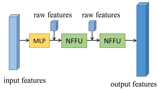 For the point cloud Pl and its subsampled point cloud Pl+1, some important points in Pl may be dropped after downsampling, which leads to the degradation of network performance. We need to increase the probability that the information of the points in Pl will propagate to Pl+1, allowing us to reduce the impact of some important points being discarded on the network performance. Inspired by [,], we simply stacked multiple NFFUs to form an extended neighborhood feature fusion block (ENFFB), which enabled us to reserve more information of points at a low cost.